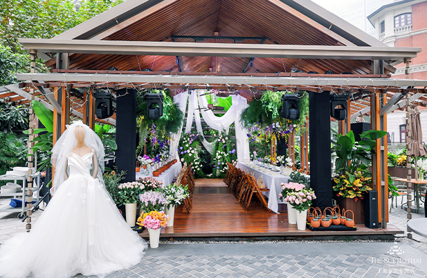 酒店在2025年推出婚禮主題沙龍「森庭花嶼」,從綠色植物、光影到藝術裝置皆精心雕琢,呈現愛在自然中生長、在光影中延展的浪漫寓意。沙龍選址於酒店一層的 The ZUK Bar戶外花園,綠意流動、木屋錯落,微風穿行其中,營造出城市中央難得的靜謐秘境。新人踏入其間,宛如置身秋日花園,於花影搖曳間開啟屬於兩人的浪漫篇章。